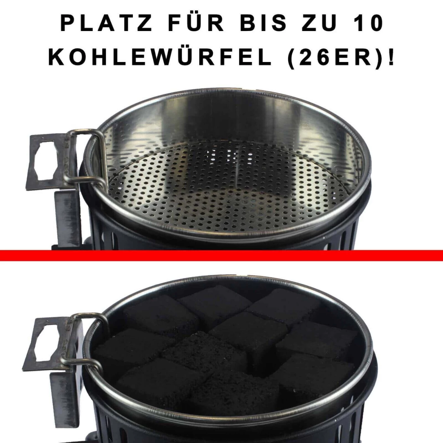 Mit dem Kohleanzünder wird ein zusätzliches Sieb geliefert, welcher unmittelbar auf die Heizspirale gelegt wird um die Lebensdauer zu verlängern. Zeitgleich gibt es an dem Sieb eine Schlaufe, in der der mitgelieferte griff eingerastet werden kann, um somit einen zusätzlichen Kohlekorb für das transportieren der glühenden Kohlen zu ersparen.