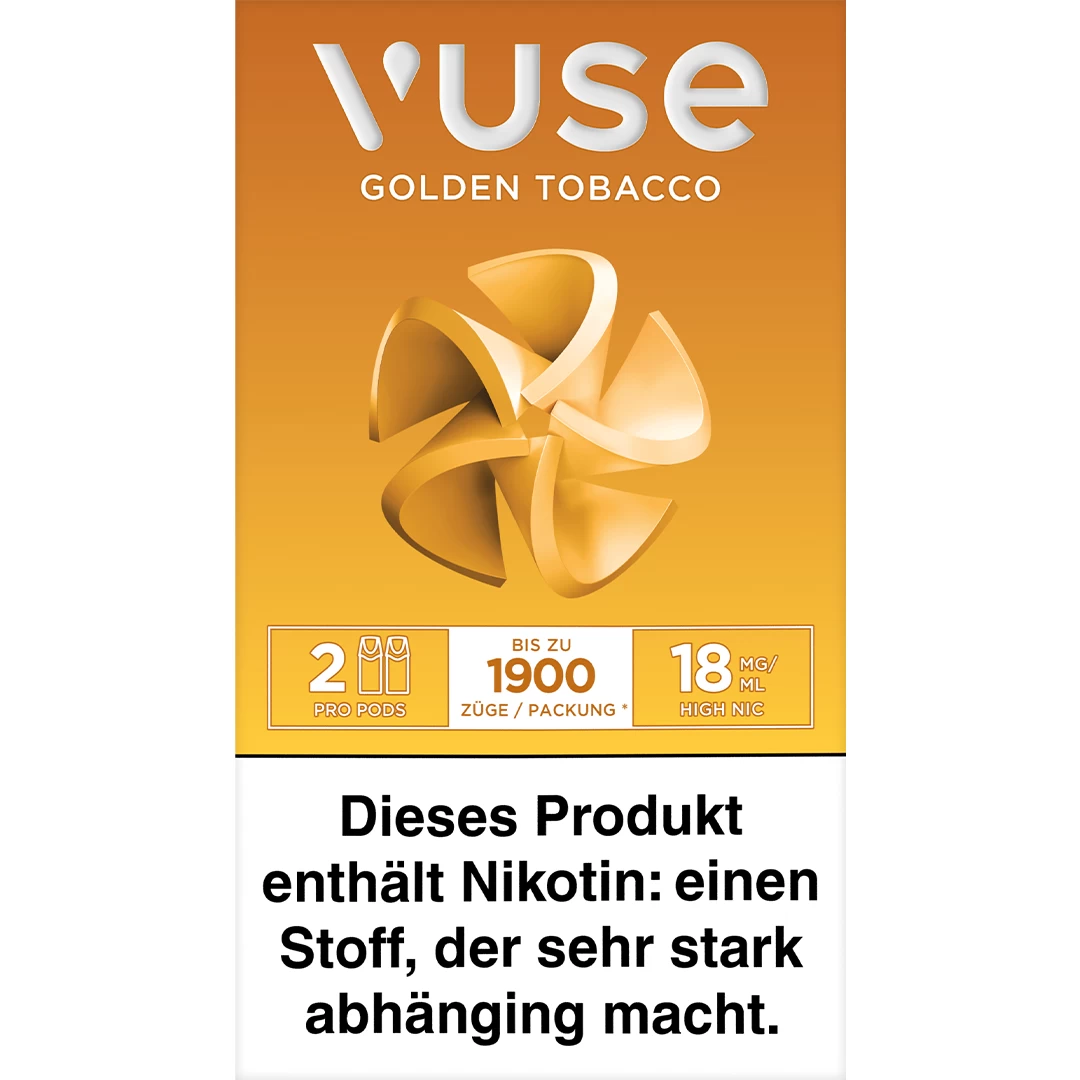 VUSE PRO POD GOLDEN TOBACCO mit 18 mg/ml Nikotin und dem klassischen Geschmack von sonnengereiftem Tabak.