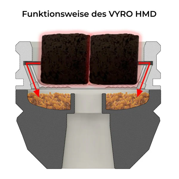 - Vorbereitung: Vor der ersten Benutzung den VYRO HMD leicht ausbrennen, um Produktionsrückstände zu entfernen. Lege dazu 2–3 glühende Shishakohlen in den HMD und lass ihn 10–15 Minuten stehen. Achtung: Der HMD darf dabei nicht direkt auf den Kohleanzünder gelegt werden!