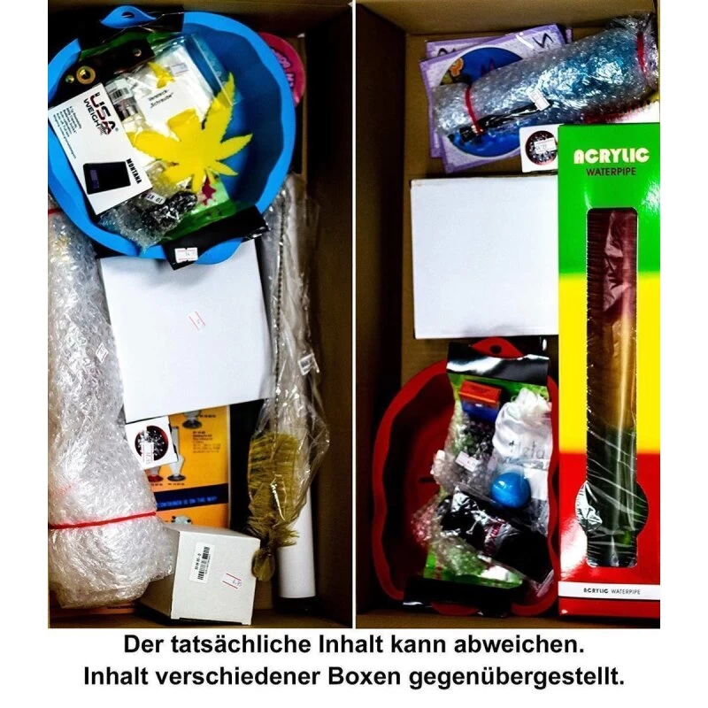 Lasst Euch überraschen – In jedem Paket ist mindestens eine Bong oder ein Vaporizer, dazu verschiedenste Kleinteile wie Grinder, Pur-Pfeife, Chillum, Kopf, Papers, Siebe, AktiTube, Glas-pfeifen, Shisha, Schmand-Weg,