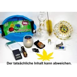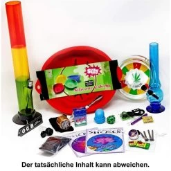 Ihr erhaltet eine Wundertüte mit diversen Überbeständen und Retouren – zum ganz überwiegenden Teil neue und unbenutzte Ware von bong-discount. Die Abbildung ist ein Beispiel welche Ware enthalten sein kann.